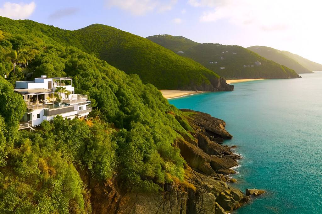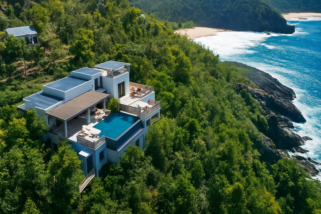 Set in a spectacular clifftop location next to one of the most beautiful and secluded beaches in Tortola, The House of Rogues is a rare, stylish architectural gem set in lush terraced gardens. The large infinity edge pool is designed to mirror the natural beauty of the sea below and the sweeping views along the rugged Atlantic coast. With 5 bedrooms the house can accommodate up to 10 guests. The décor, furnishings and high end appliances are an eclectic mix of antique and modern chic.